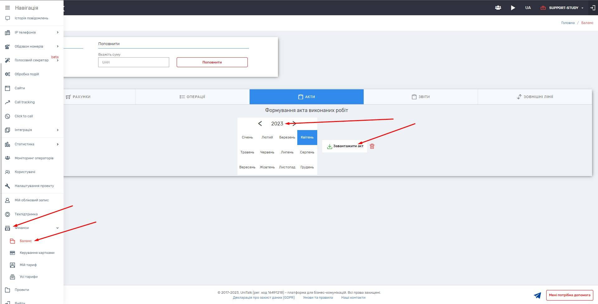 Сформувати акт виконаних робіт можливо в особистому кабінеті UniTalk в розділі “Фінанси” → “Баланс”. Для формування акта виконаних робіт перейдіть до підрозділу “Операції”, задайте період, за який потрібно сформувати акт виконаних робіт, і натисніть “Завантажити акт”. Після цього унизу екрану у полі “Завантаження” з’явиться акт:
