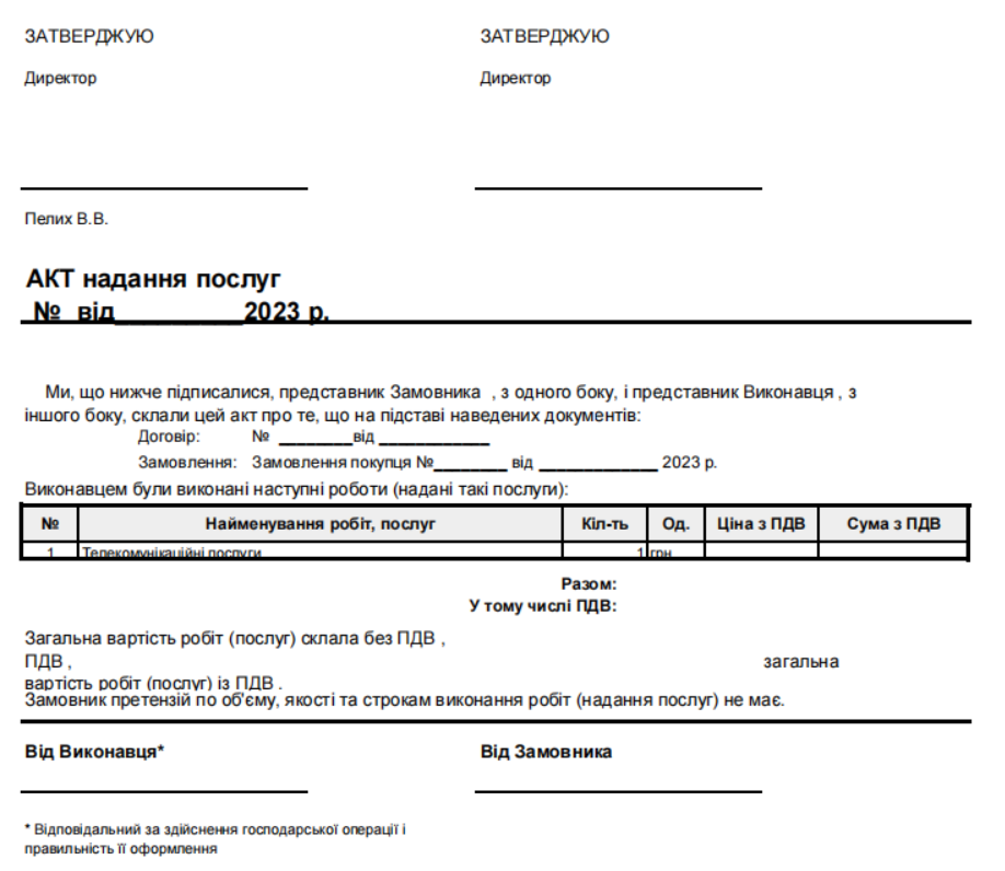 У генерованих через Особистий кабінет рахунках на оплату та актах виконаних робіт рядки “Призначення платежу” та “Платник” спочатку містять лише номер рахунку-фактури та дані, які були введені на етапі реєстрації в системі.