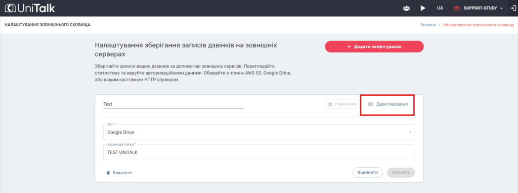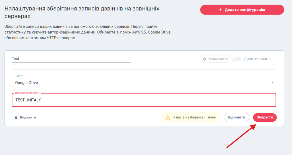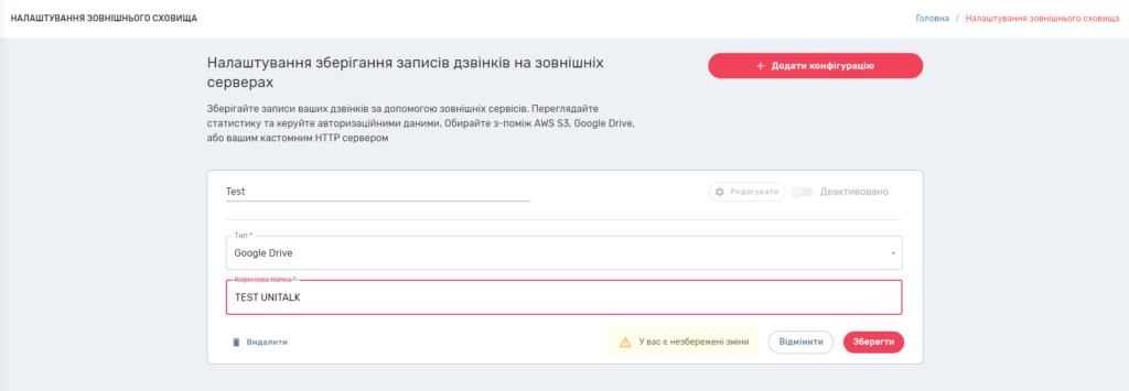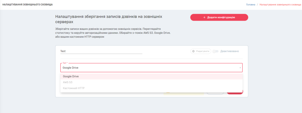 Записи дзвінків спочатку завантажуються на наш сервер, а потім, при необхідності, переносяться на зовнішнє сховище. Якщо конфігурація активна, всі старі дзвінки проекту поступово переносяться на вказаний під час авторизації Google диск. Нові дзвінки переносяться відразу після завершення.