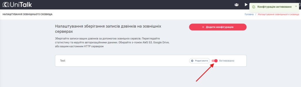 Після успішної авторизації нас повертає на сторінку із налаштуванням зовнішнього сховища в особистому кабінеті. Також з’являється можливість активувати створену конфігурацію: