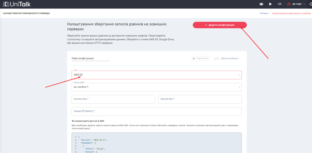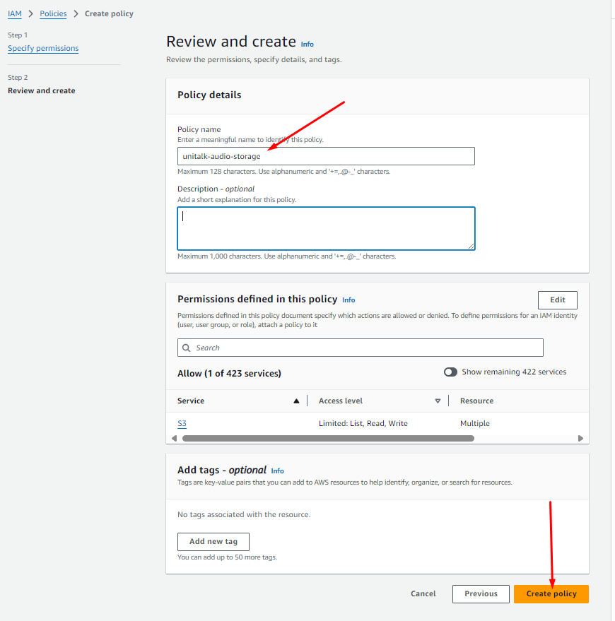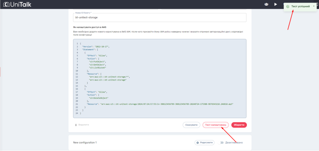 3) Створення політики доступу, необхідної для завантаження аудіо із Unitalk в S3