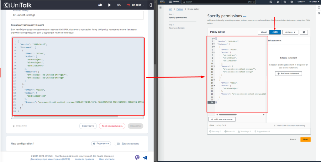– Шаблон із необхідними правами доступу копіюємо із особистого кабінету Unitalk. Обираємо спосіб задання прав доступу JSON та переходимо далі по налаштуваннях політики