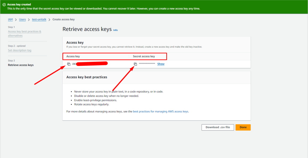 – Обов’язково копіюємо Access key та Secret access key, адже саме їх потрібно вказати у налаштуваннях конфігурації зовнішнього сховища в Unitalk. Натискаємо «Done».