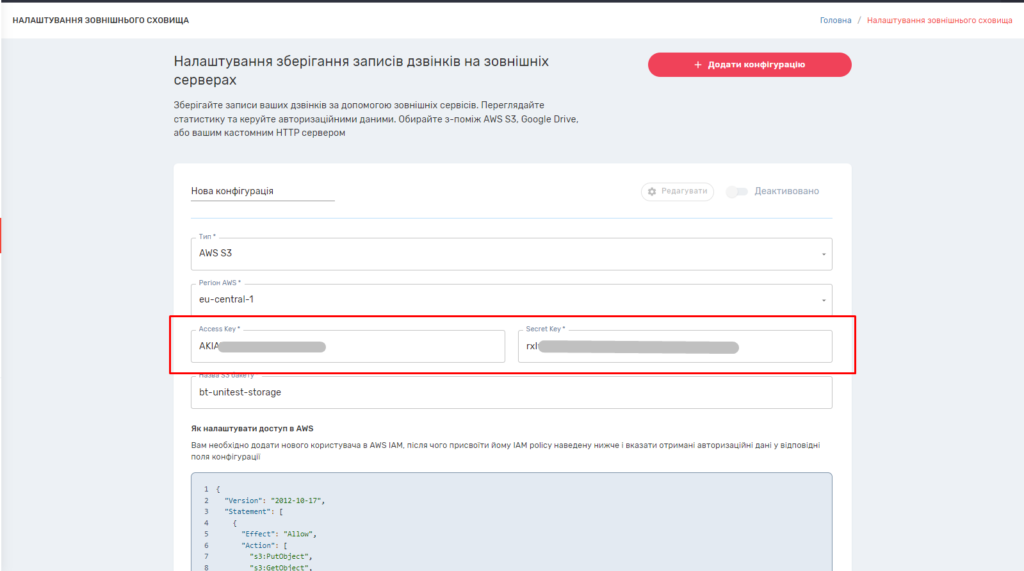 Налаштування зовнішнього сховища для аудіозаписів у AWS s3