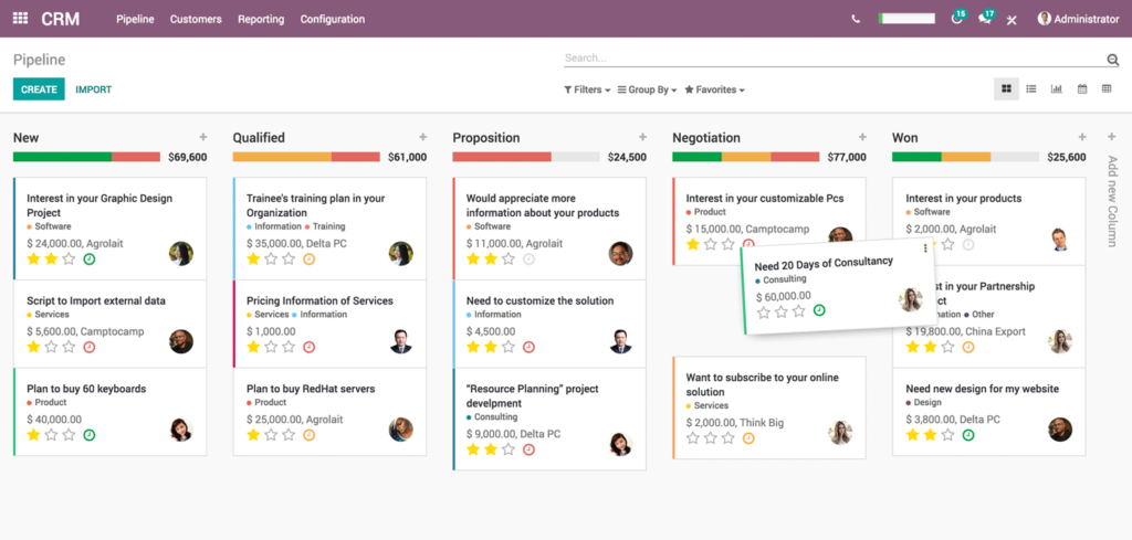 - Універсальні платформи. Це вже досить складні системи, такі як Zoho, Creatio, Odoo, розраховані на середній та великий бізнес. І якщо попередні дві категорії підійдуть для компаній з невеликою кількістю користувачів, то коли відділ продажів налічує хоча б 10 менеджерів або більше, варто розглядати саме універсальні складні рішення. Зазвичай вони здатні автоматизувати велику кількість процесів, і CRM – це лише одна з їх функції. Так, наприклад, за потреби ви можете підключити систему для обліку, для HR менеджменту, для документообігу – і все це в рамках обраної платформи.