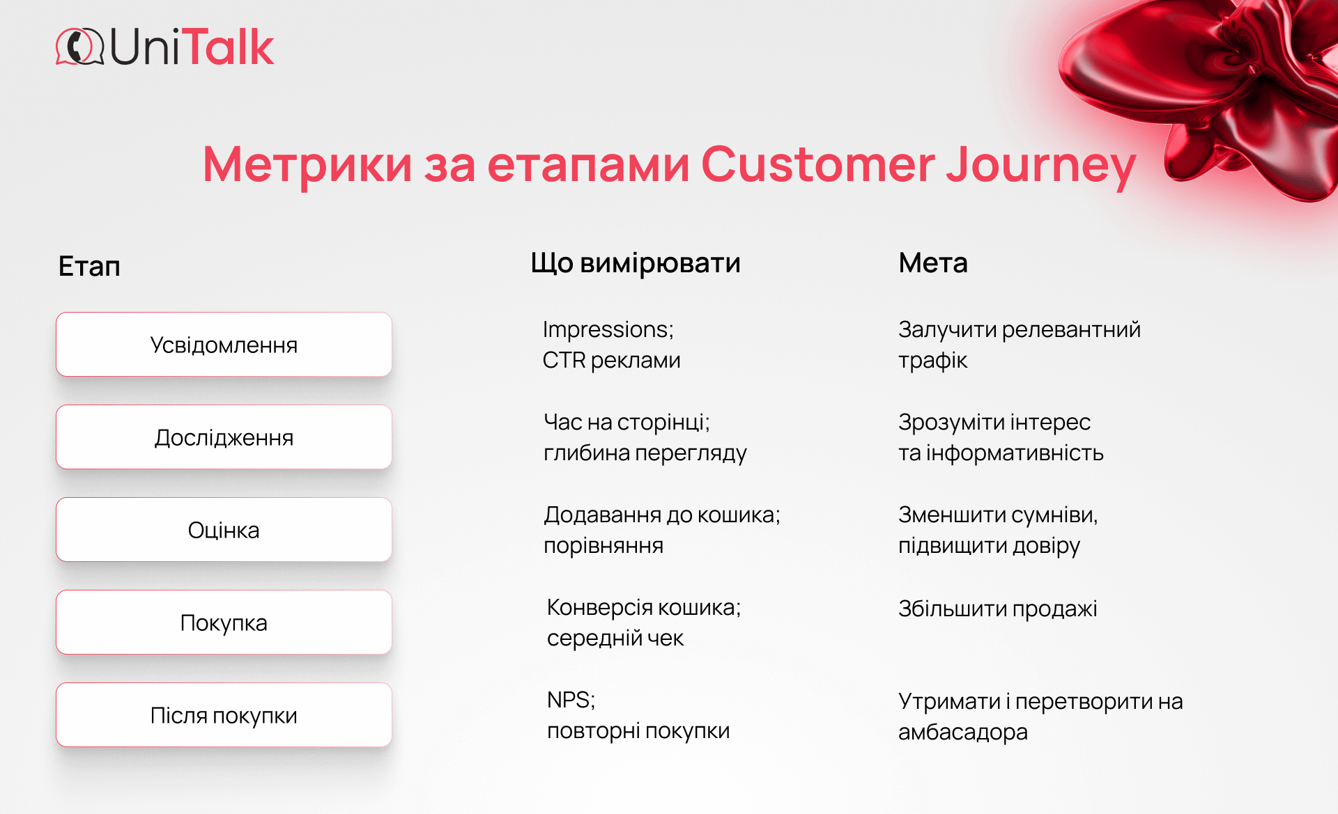 - Етапи шляху (awareness, consideration, decision, post-purchase).