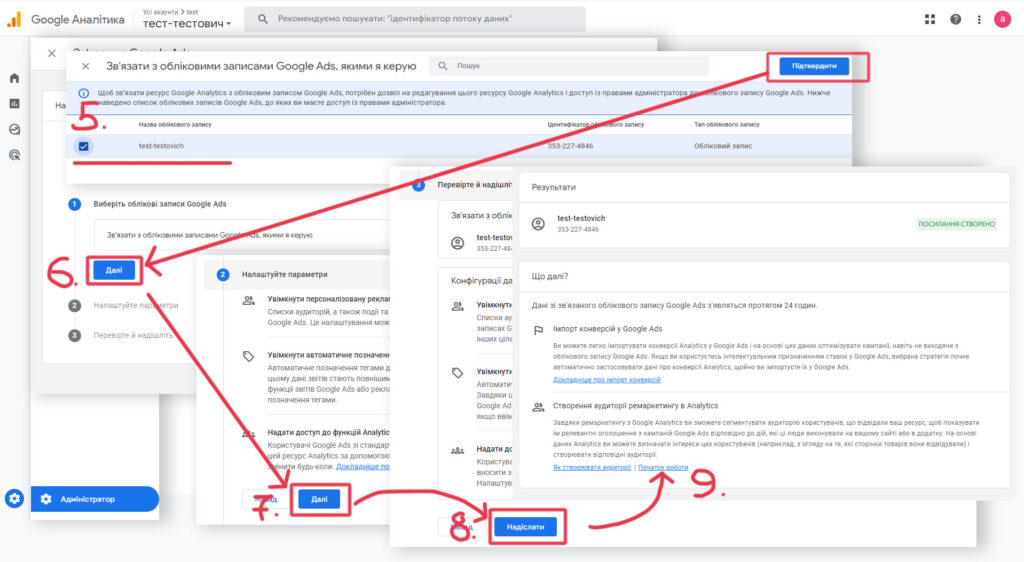Крок 8: На фінальному кроці перевіряєте, чи все гаразд, тиснете кнопку “Надіслати” Google Analytics трохи “задумається” та відзвітує, що зв’язок створено, якщо все пройшло, як треба. Можна закривати вкладку. Рекламний акаунт Google Ads має з’явитися в переліку тих, які під’єднано до ресурсу Google Analytics.