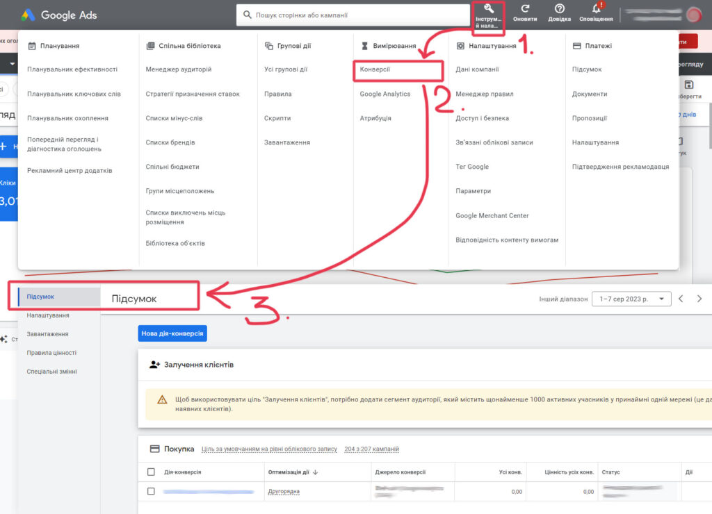 Тепер слід зробити так, щоб рекламний аккаунт побачив нові створені конверсії. Для цього перейдіть в акаунт Google Ads, який ми щойно під’єднали, натисніть на гаєчний ключ “Інструменти й налаштування” (Крок 1), що знаходиться ближче до правого верхнього кутка. В стовпчику “Вимірювання” знайдіть пункт “Конверсії” (Крок 2), натисніть на нього та перейдіть у розділ “Підсумок” (Крок 3).