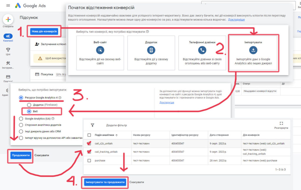 Натисніть “Продовжити”. В наступному вікні Google Ads запропонує список конверсій, які ще не було імпортовано до рекламного акаунту з підключеної Google Analytics. Вибираємо галочками ті конверсії, які нам необхідні. В нашому випадку — це call_tracking_unitalk та call_c2c_unitalk.