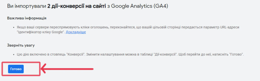 Це можна змінити відразу або почекати 14 днів, як це рекомендує Google в повідомленні. Якщо відразу, клікніть на кнопку “Готово”. Імпорт конверсій завершено. Якщо ж у вас стояла Universal Analytics, то вам доведеться зробити ще декілька кроків.