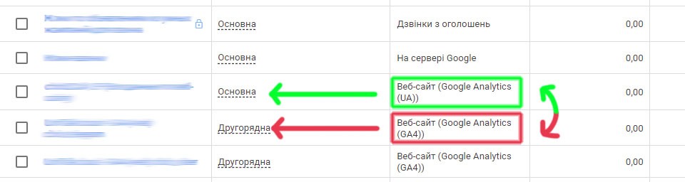 Потрібно поміняти конверсії місцями. Щойно створеним задати статус “Основний”, а тим, що належать до старої аналітики Universal Analytics — “Другорядний”.