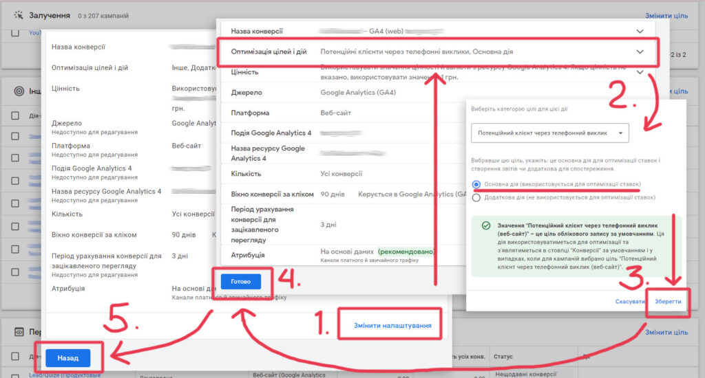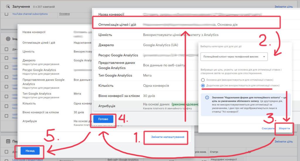 Далі слід обрати конверсію від Universal Analytics. Наприклад ту, що стосується колтрекінгу, натиснути на неї, в вікні налаштування в правому нижньому кутку натиснути “Змінити налаштування”. Далі обрати другий рядок “Оптимізація цілей і дій” та налаштувати перемикач в положення “Додаткова дія (не використовується для оптимізації ставок)”.