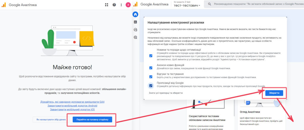 Залишився останній крок — перейти на головну сторінку аналітики. Але перед завершенням створення аналітики, Google захоче налаштувати параметри email розсилки. Тут все просто — якщо хочете отримувати новини на свою поштову скриньку, поставте галочки та натисніть “Зберегти”.