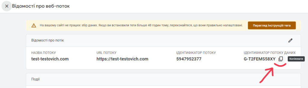 Після створення потоку даних ви отримаєте ідентифікатор вашого потоку даних (також відомий як “Ідентифікатор Потоку Даних” або “Тег Google Analytics 4”). Збережіть цей номер собі в таємний блокнот, оскільки він потрібний для налаштування коду відстеження Google Analytics 4 на вашому сайті чи додатку. Якщо ж Google автоматично вже створив для вас потік даних, то, натиснувши на розділ “Потоки даних” і обравши відповідний ресурс, ви також знайдете свій “Ідентифікатор потоку даних”: