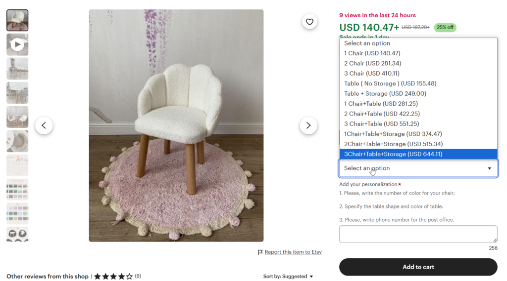 Стратегія upsell пропонує клієнту обрати преміальний або функціонально розширений товар. У нашому проєкті, магазині на Etsy, у видачу попадали дешевші варіанти товарів, тобто один виріб з меншою ціною, але при переході на лістинг покупець розумів, що може обирати наскільки креативним буде його дизайн та яка кількість йому потрібна. Відповідно від цього зростав середній чек покупки.