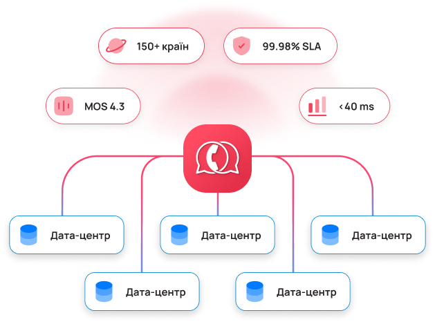 - Забезпечує: відмовостійкість SLA 99.98%, якість голосу MOS 4.3, затримку <40мс.