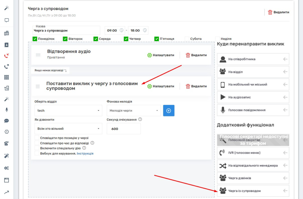 Сьогодні ми оновили функціонал вхідних сценаріїв – додали голосові черги із супроводом. Цей функціонал дозволяє більш детально налаштувати голосові черги дзвінків.