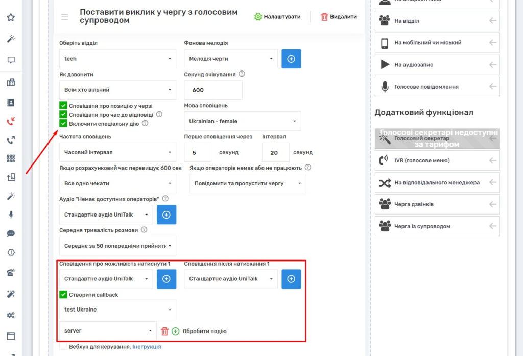Також можна настроїти спеціальну дію при натисканні клієнтом кнопки «1»: можна ввімкнути функцію callback та додати дії обробки події. Ви можете додати такі дії: надсилання повідомлень у Telegram, додавання номерів в обдзвон, дії в CRM системах, відправлення веб-хуків, відправлення повідомлення через сервіс надсилання повідомлень.