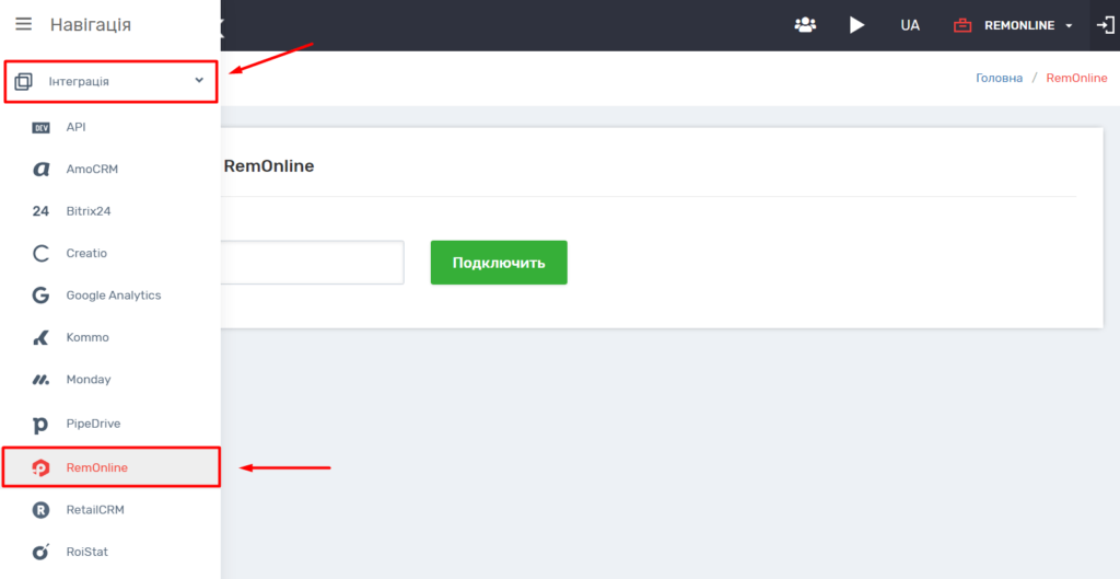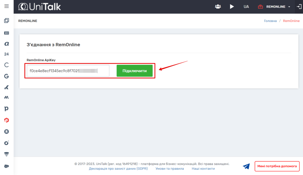 2. Далі в особистому кабінеті UniTalk перейдіть за посиланням у розділі “Інтеграція”, знайдіть поле “RemOnline ApiKey” і вставте скопійований API ключ. Натисніть кнопку “Підключити”.