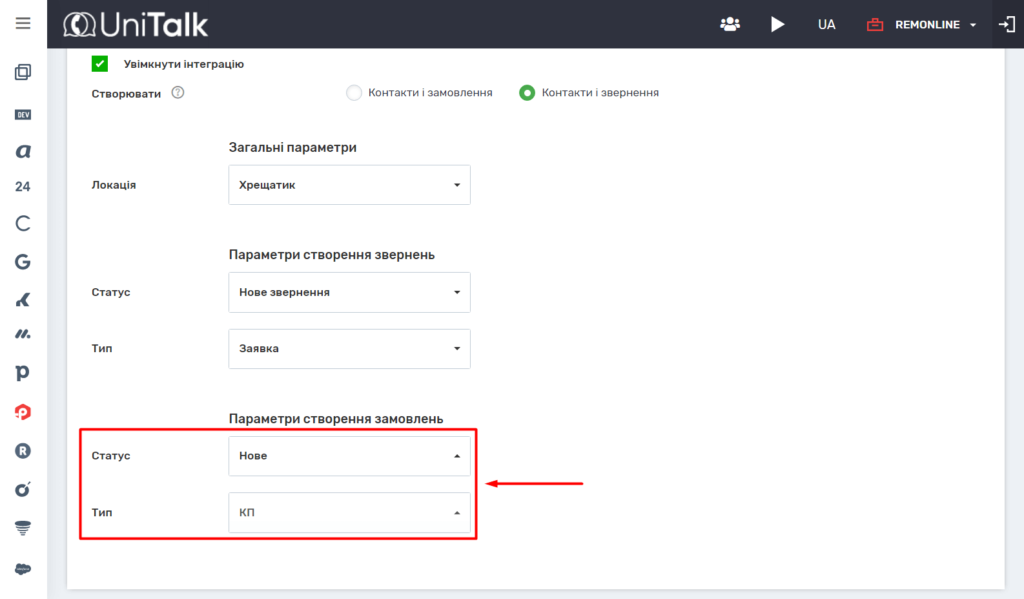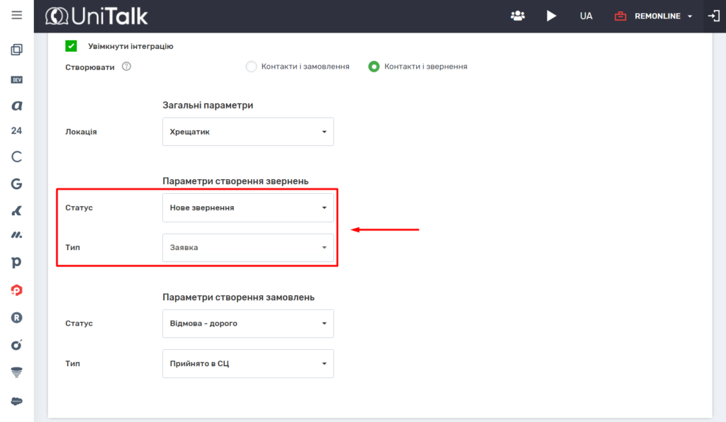 5. У розділі “Параметри створення звернень” або “Параметри створення замовлень” налаштуйте статус і тип відповідно звернень або замовлень.