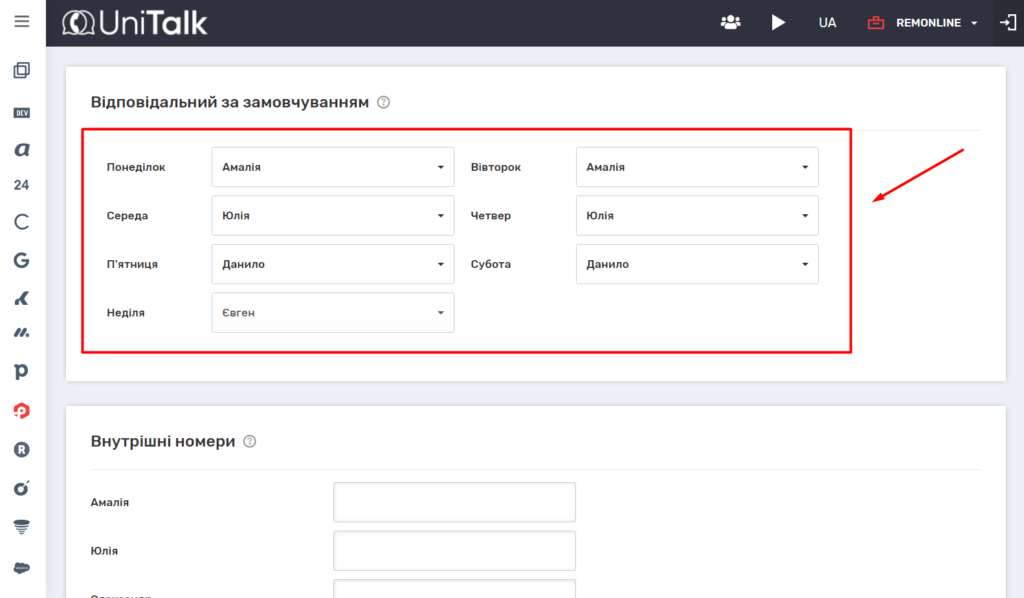 6. У розділі “Відповідальний за замовчуванням” можете вказати дані відповідального менеджера для пропущених дзвінків. Можна призначити одного або кілька менеджерів. Можна призначити різних відповідальних у різні дні тижня. Якщо такої потреби у вас немає, поле “Відповідальний за замовчуванням” можна залишити порожнім.