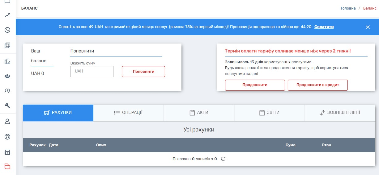 У тестовий період не включені вартість підключення та оренди телефонних SIP-номерів, тарифікація вихідних дзвінків (крім дзвінків з використанням особистих SIP-номерів), вартість SMS-повідомлень та інтернет трафіку (для номерів FMC), тарифікація дзвінків у послугах «Автообзвон» та « Гарантований дозвон», оскільки дані послуги надаються операторами зв’язку та формування та регулювання вартості даних послуг відбувається на стороні операторів зв’язку. Для використання платних послуг необхідно поповнити баланс у розділі «Фінанси» → «Баланс»