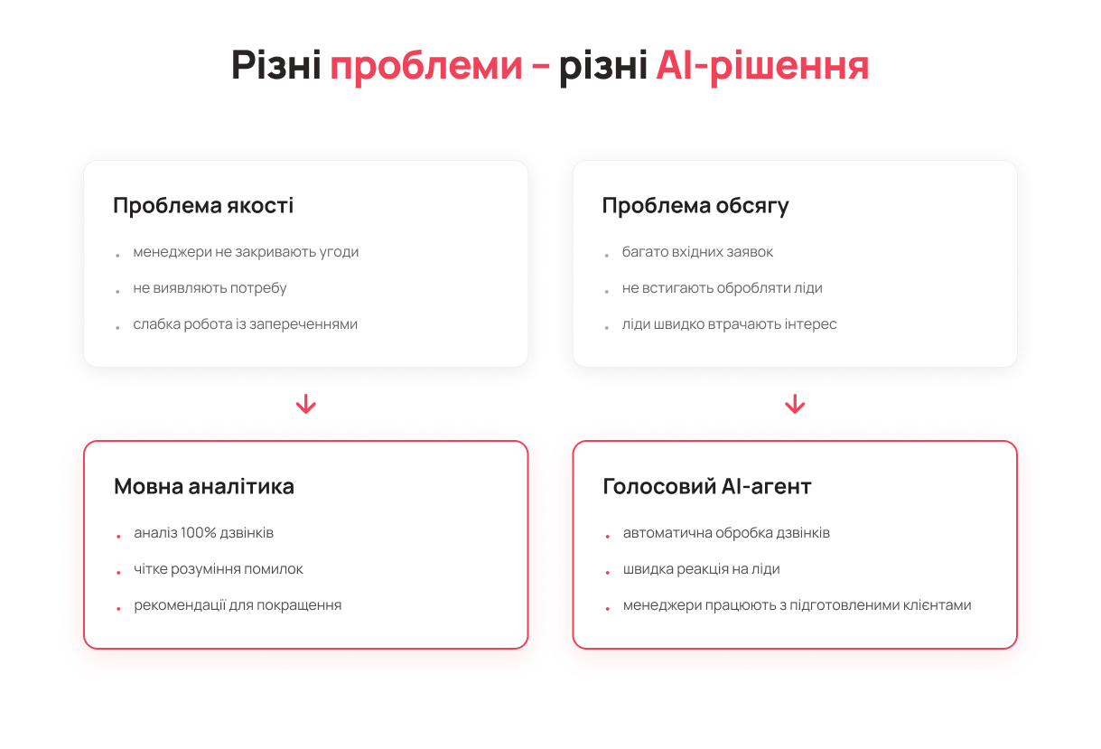 Крок 2. Оберіть правильний інструмент – Голосовий агент вирішує проблему доступності і рутини, Мовна аналітика – проблему якості і розуміння. Це різні задачі, і часто вони чудово доповнюють одна одну: агент приймає ліди, аналітика допомагає зрозуміти, як менеджери їх закривають.