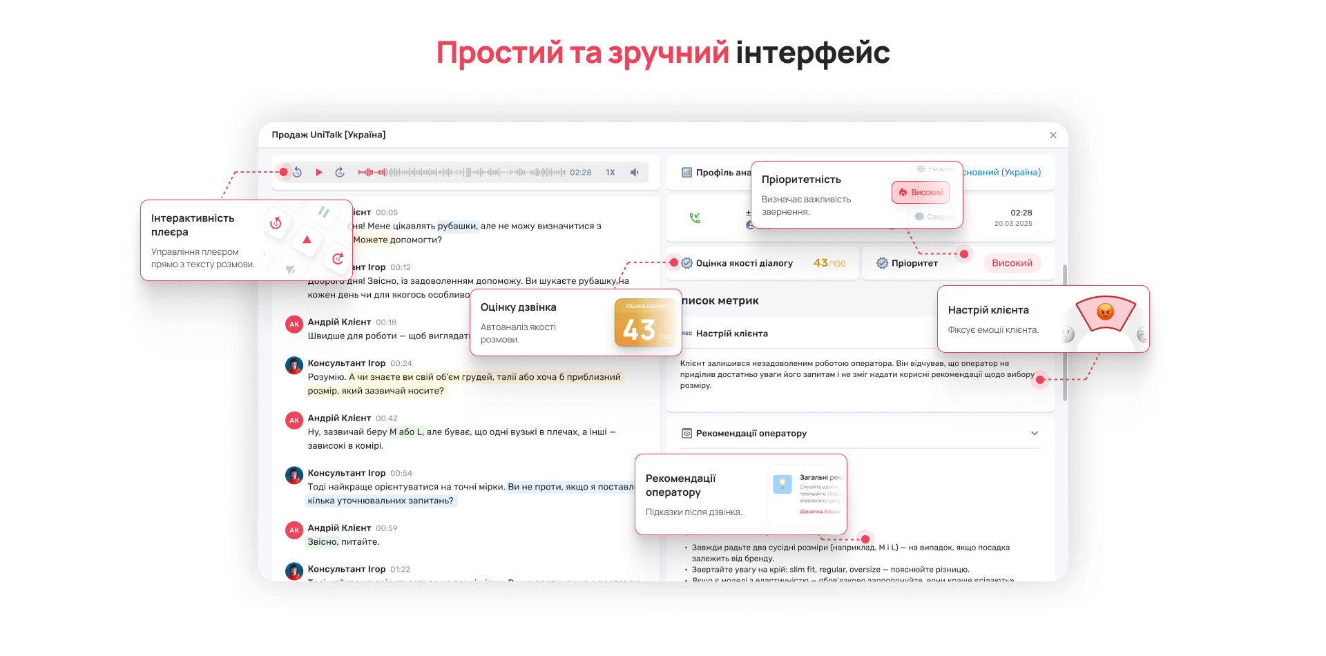 Мовна аналітика UniTalk допомагає навести порядок у роботі відділу продажів. Вона автоматично аналізує 100% дзвінків, перетворює їх на структуровані дані і показує, де саме менеджери втрачають угоди: на етапі виявлення потреби, презентації чи роботи із запереченнями.