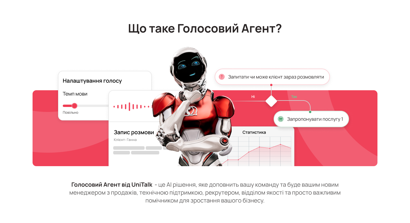 Голосовий AI-агент UniTalk бере на себе рутинну комунікацію з клієнтами. Він сам відповідає на дзвінки і телефонує, обробляє вхідні заявки, уточнює деталі, відповідає на типові запитання і передає менеджерам вже підготовлені, “прогріті” ліди.