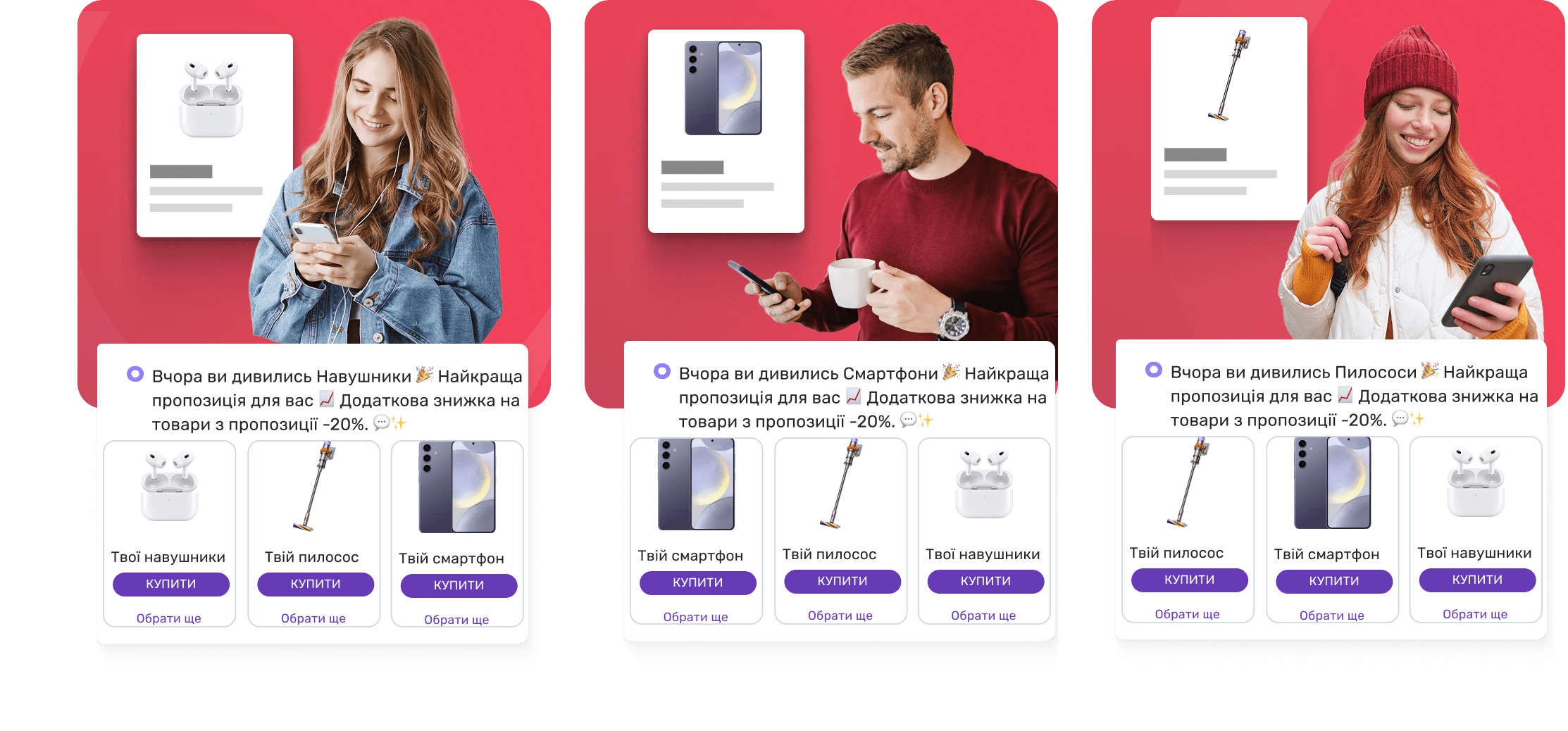 - Ігор вчора дивився смартфон на вашому сайті? ШІ поставить смартфон першою карткою у його персональній розсилці.