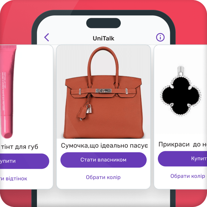 Кожна картка — це окремий товар з фото, описом, ціною та кнопкою “Купити”. Це ваша міні-вітрина прямо в телефоні покупця.